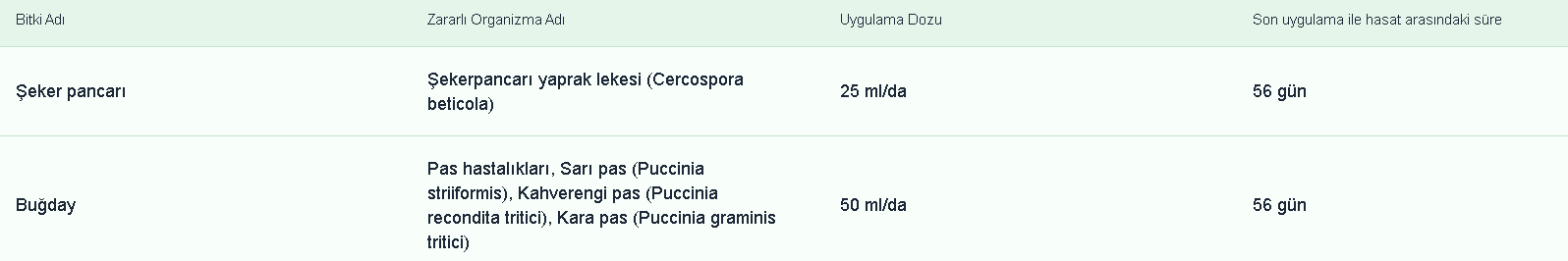 Buğdayda pas hastalıkları (Sarı pas, kahverengi pas, kara pas): Hastalık belirtileri (püstüller) görüldüğünde uygulamalara başlanmalıdır. Pas etmenlerine karşı yeşil aksam uygulaması yapılır. Yaprakların ve sapın yüzeyi karışım ile kaplanacak şekilde uygulama yapılmalıdır. Koşullar hastalığın gelişimi için uygun seyrederse ürünün etki süresi de dikkate alınarak ikinci uygulama yapılabilir.